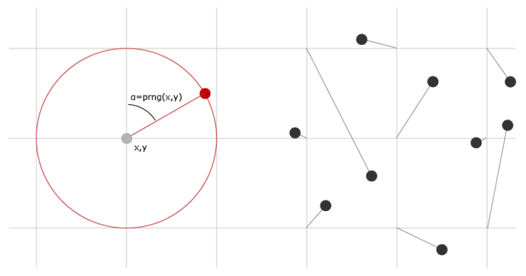 Instead of an actual prng I used Perlin noise, which makes the movement possible (and takes multiple arguments). If you need static particle scattering it will be faster to use a regular prng. But you’ll have to turn the x and y values into a single seed without mirroring the field diagonally (for instance: x+1E6*y).